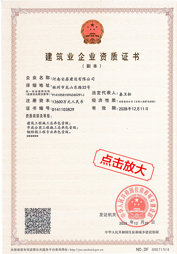 滔滔黃河哺育了中華民族拼搏向上的奮斗精神,巍巍太行造就了中原兒女的紅旗渠精神。百萬林州人下太行,鑄就了中國建筑之鄉響當當的耀眼品牌。河南安居建設有限公司從誕生起血液里就流淌著紅色基因,秉承“安得廣夏千萬間,大庇天下寒士俱歡顏”的擔當精神,用鋼筋混凝土筑起了高樓大廈,也用一流品質、家國情懷打造了安居建設的輝煌成績。公司成立于2012年,注冊資金12600萬元,公司成立至今,擁有建筑,市政施工總承包等十項一級資質;其他二級等資質共二十余項。公司秉承質量第一,服務為主,堅持垂直管理,從不設立分公司等分支機構。